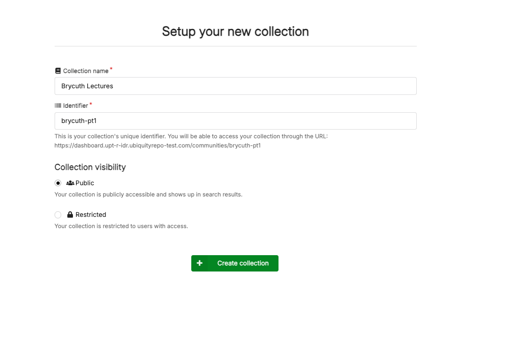 - The user must give the collection a name and an identifier (a simple, unique name to be included in the collection’s URL)
