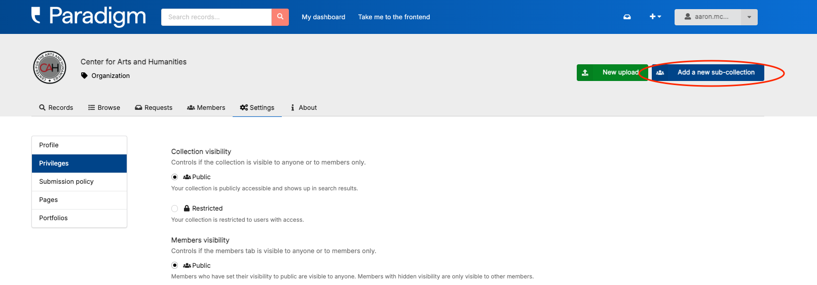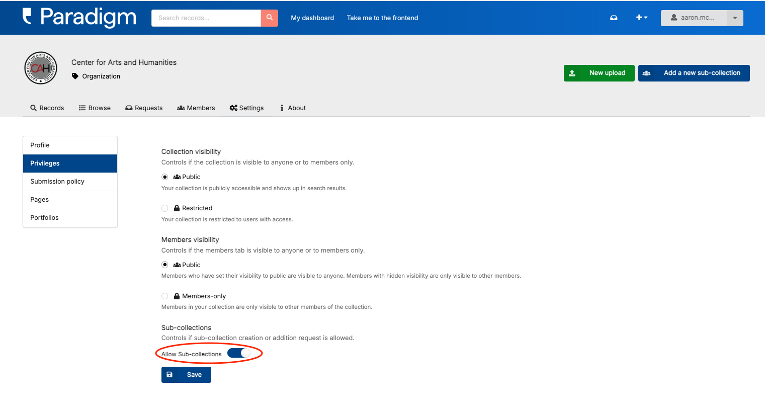 - To be used, this feature must be enabled by going to the top-level collection’s settings page, click “Privileges,” scroll down to “Allow Sub-collections” and toggle the feature on and click “Save” (note: sub-collections within sub-collections are not supported):