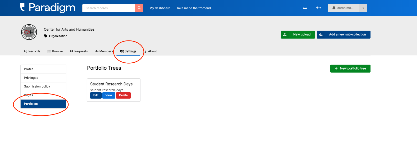 - In order to add a new portfoliotree to a collection or subcollection, the collection owner (or system administrator) should navigate to the desired collection’s settings page in the back office:
