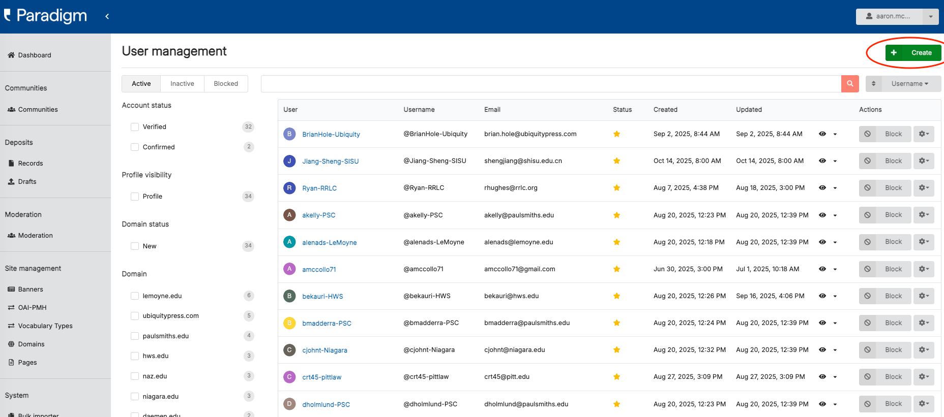 Next, click the green “+ Create” button at the top right side of user management pane: