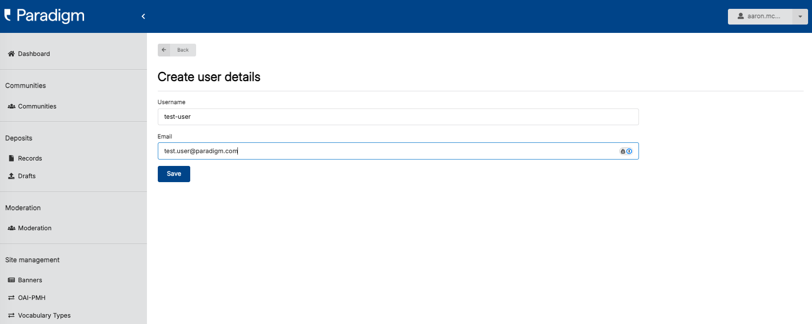 Now, under “Username,” enter a user name for the new user (note: spaces are not allowed in usernames) and, under Email, enter the new user’s email address, then press the Save button: