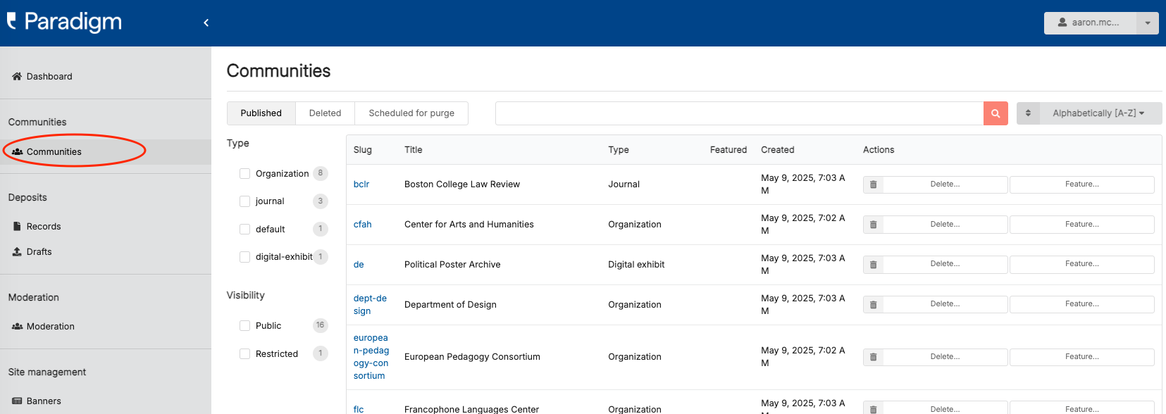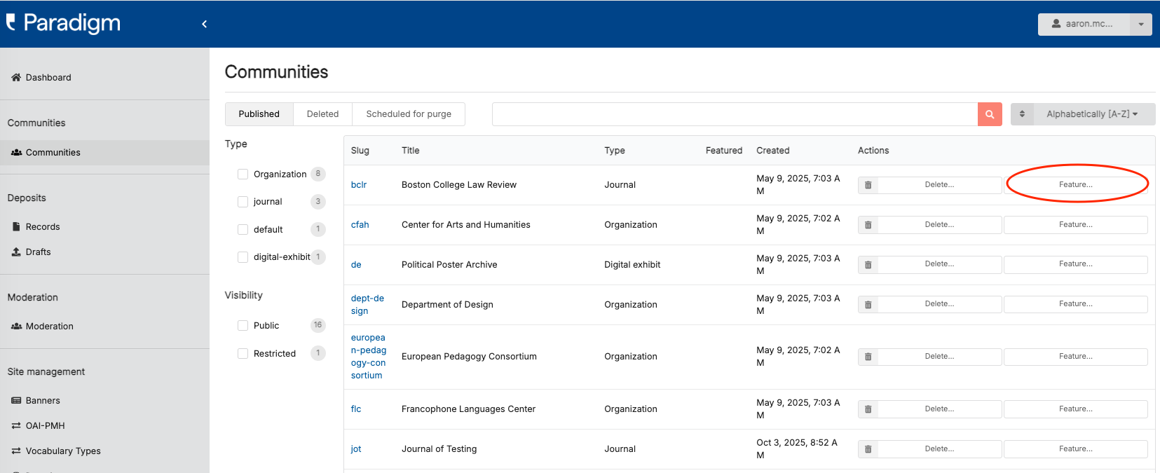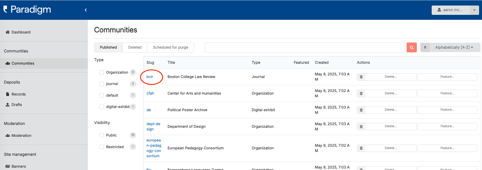 Next, search for or otherwise locate the collection you wish to remove the featured status from and click the “slug” (the blue text that comes before the title in the table row for your community).