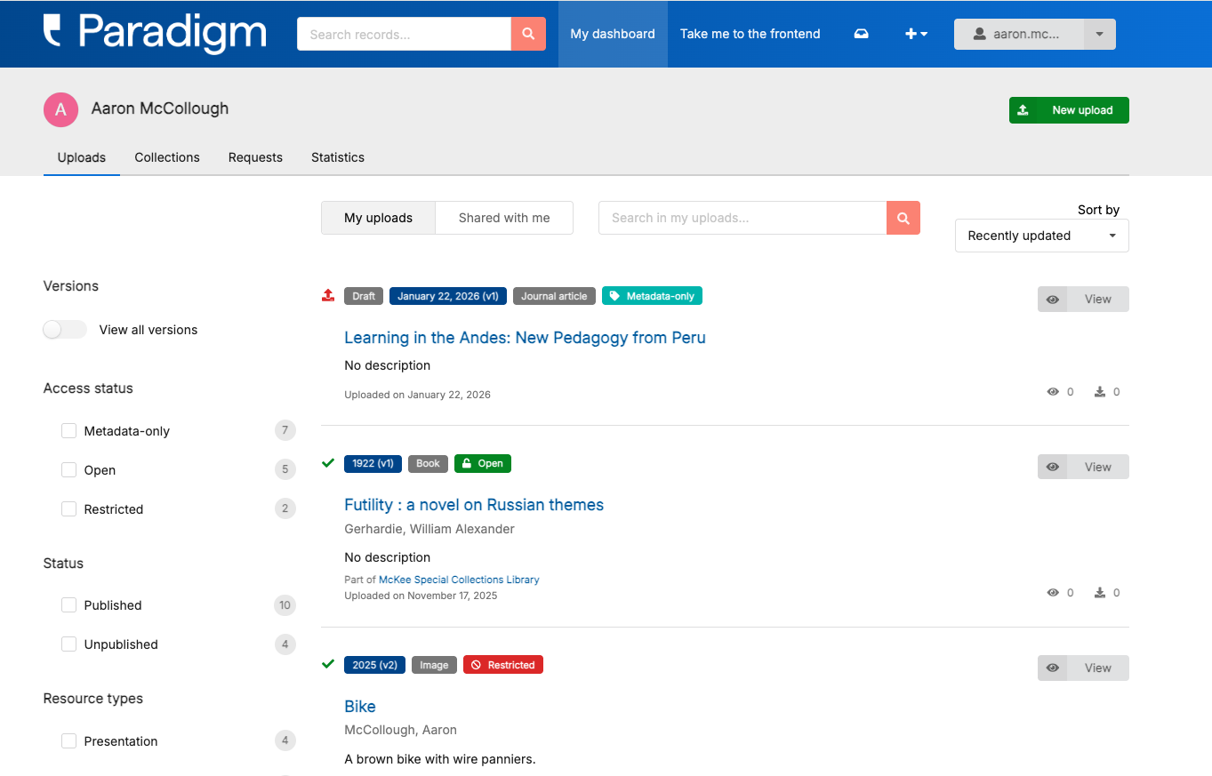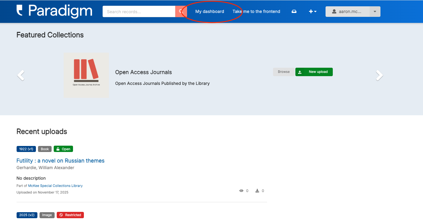 Once you are logged in, you may enter the Dashboard for access to Uploads, Collections, and Requests. Access the dashboard from the backend by clicking the “my dashboard” button in the top menu bar: