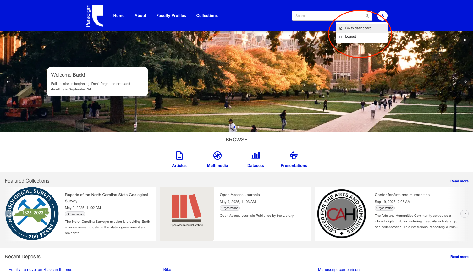 Access the dashboard from the frontend by clicking the User icon in the top right corner (to the right of the search bar), and selecting "Go to dashboard" from the dropdown: