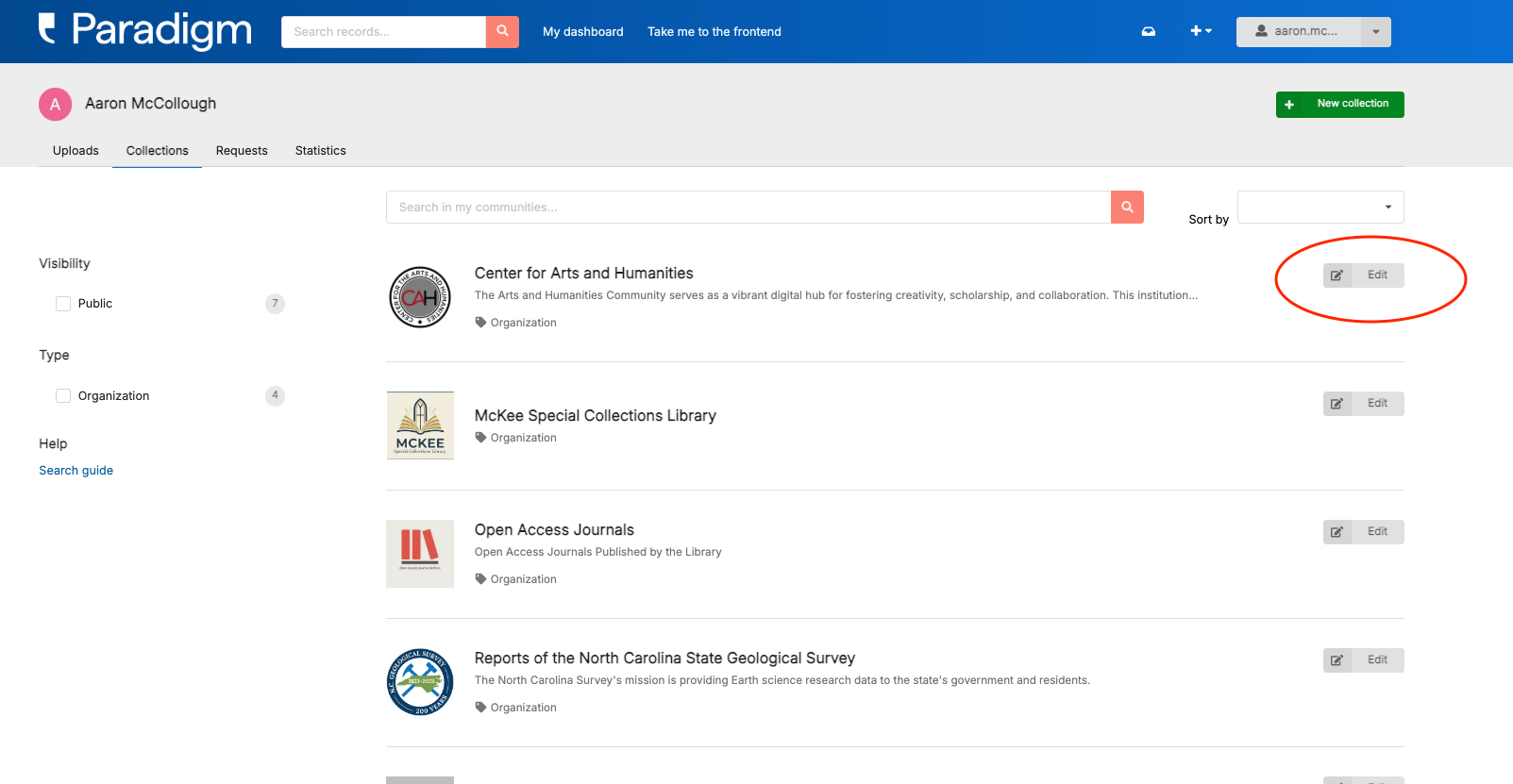 In the Collections tab of the Dashboard (sometimes labeled "communities"), view, edit, and add new Collections. Search to easily locate a specific Collection or sort by visibility and type.