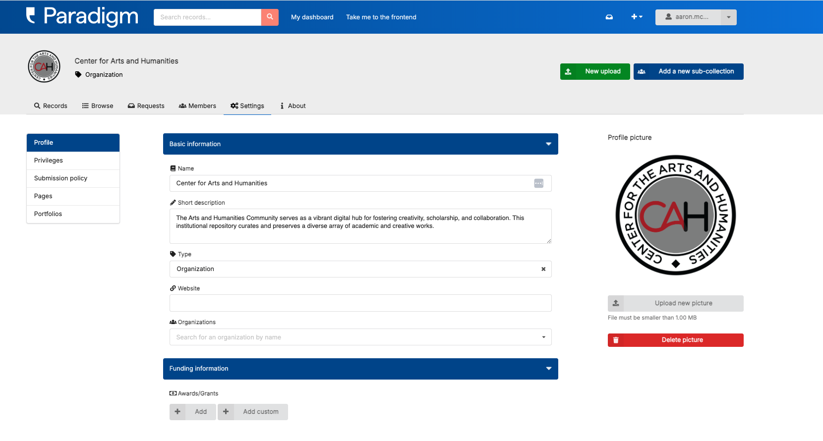 Clicking the Edit button brings you to the Collection Settings page will bring users to the Collection Settings page, where they can edit and access Basic Information. Click options in the record menu to access and edit Records, Requests, and Members.