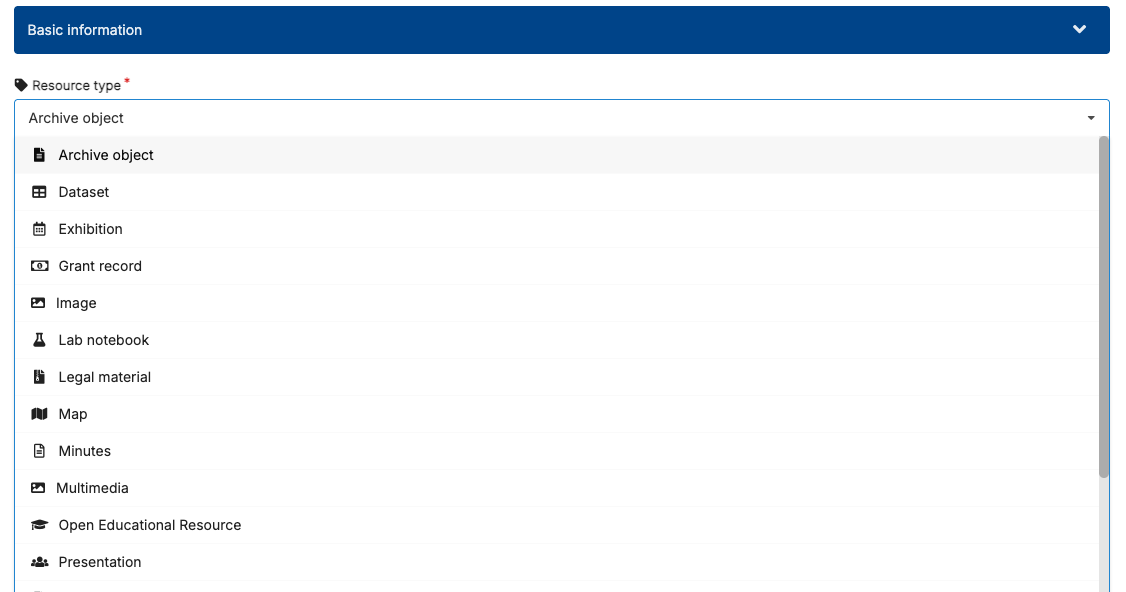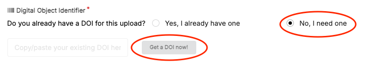 - If your repository creates DOIs, either request a new draft DOI for your record (or enter an existing DOI in cases where the record already has a DOI):
