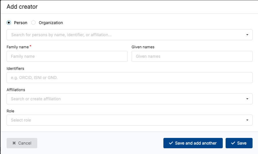 - Provide at least one "Creator" for the record (by clicking the "Add Creator button" and then filling out the fields that pop up in a modal window: