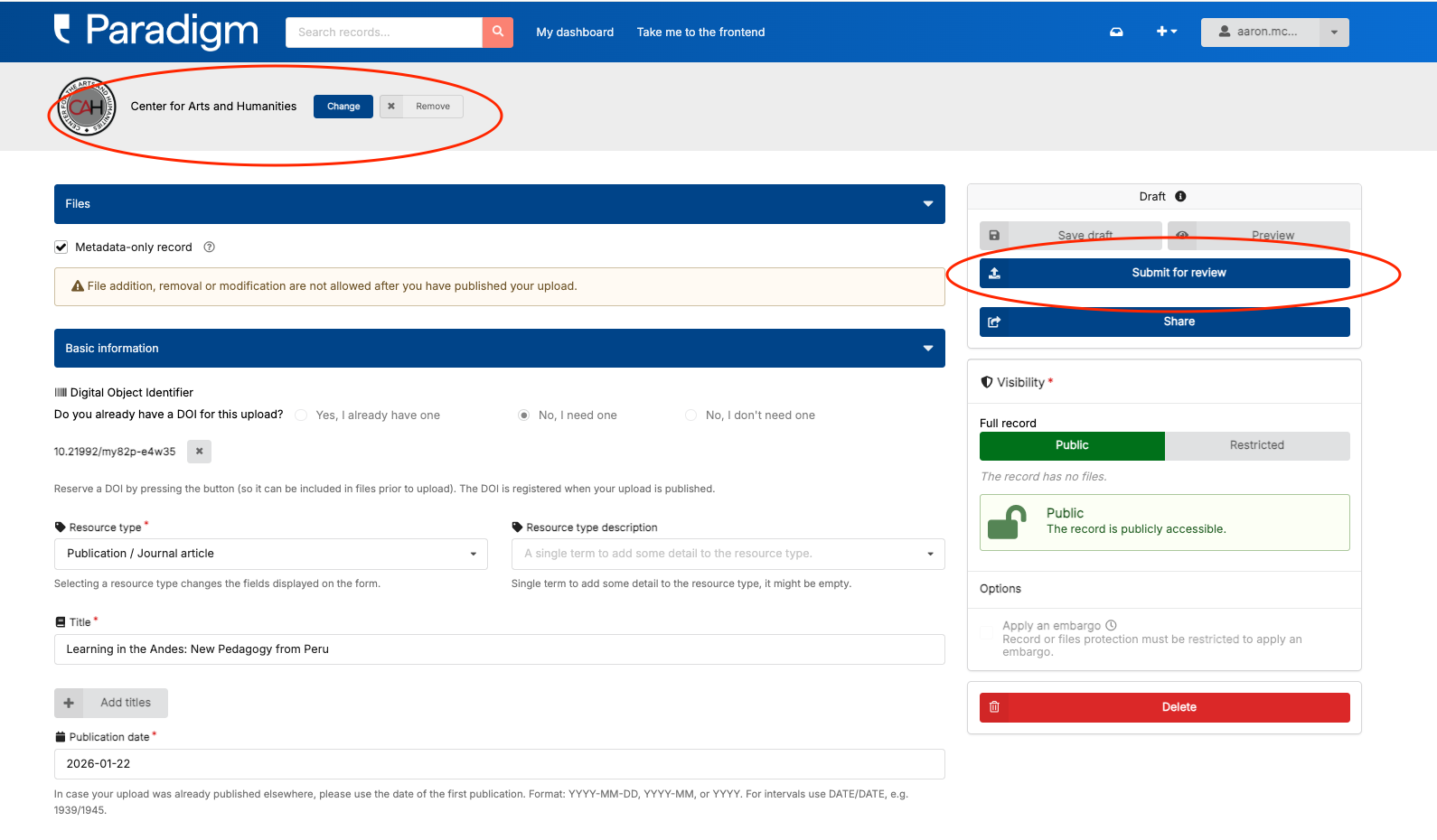 A submitter prepares a new record, selects the collection in question (with the “Select a collection”) button at the top of the deposit form, and then clicks the blue “Submit for Review” button: