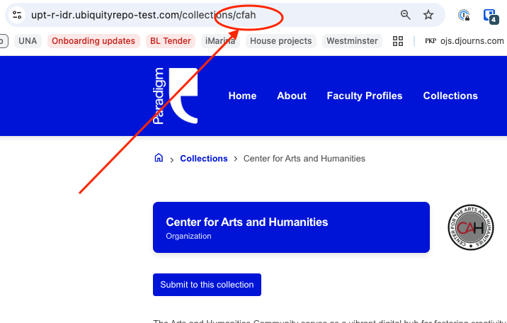 communities (column AT) (Note: communities is the system term for "collections." In the CSV, these should be identified by their unique identifier as opposed to their full name. The unique identifier can be found by visiting the collection and looking at the last section of URL, e.g.: