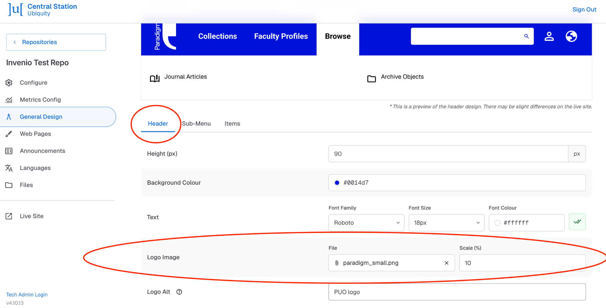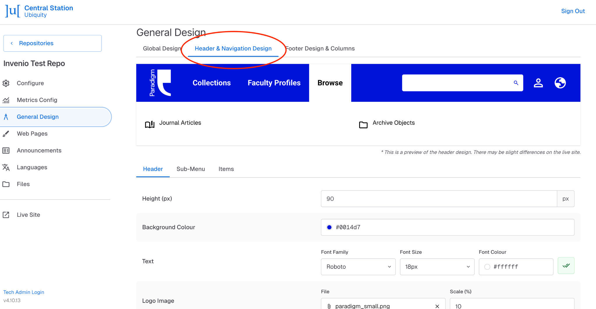 Select “General Design” from the left-hand menu. Then click “Header & Navigation Design” under the General Design top menu.