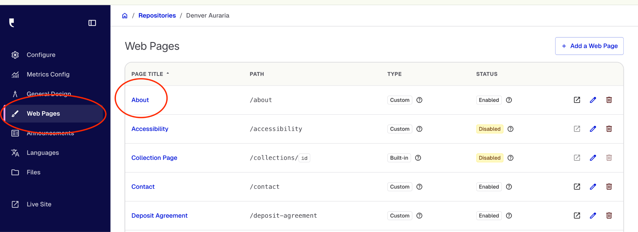 To edit the About page, first click on “Web Pages” in Central Station’s lefthand menu. Then select “About” from the list of web pages. (Because pages are displayed alphabetically, “About” should be near the top of the list.)