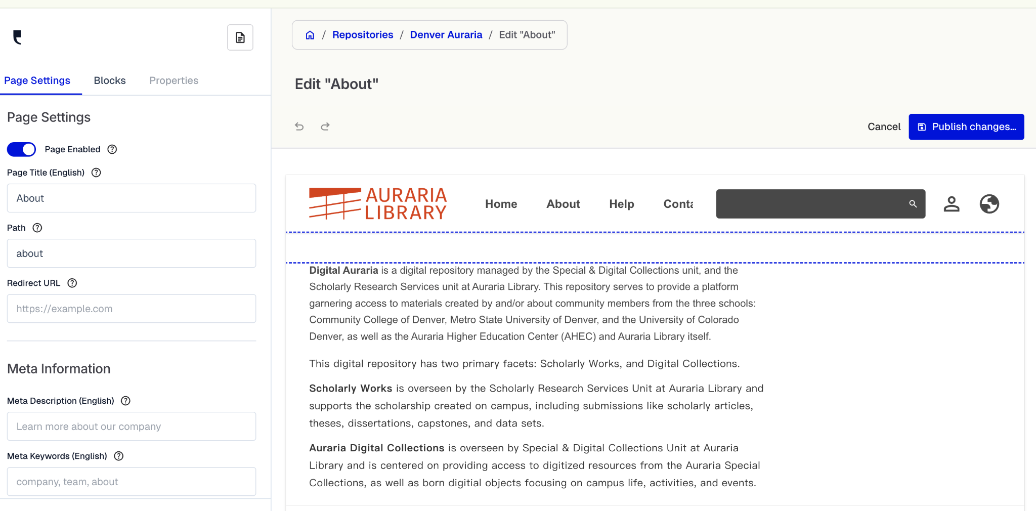 When you select “About” the hyperlink will take you to the “Edit ‘About’” dashboard, displaying both Page Settings and design Blocks.