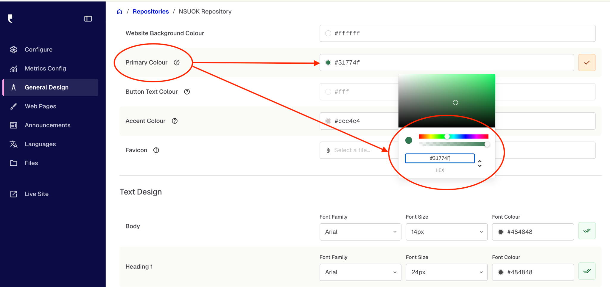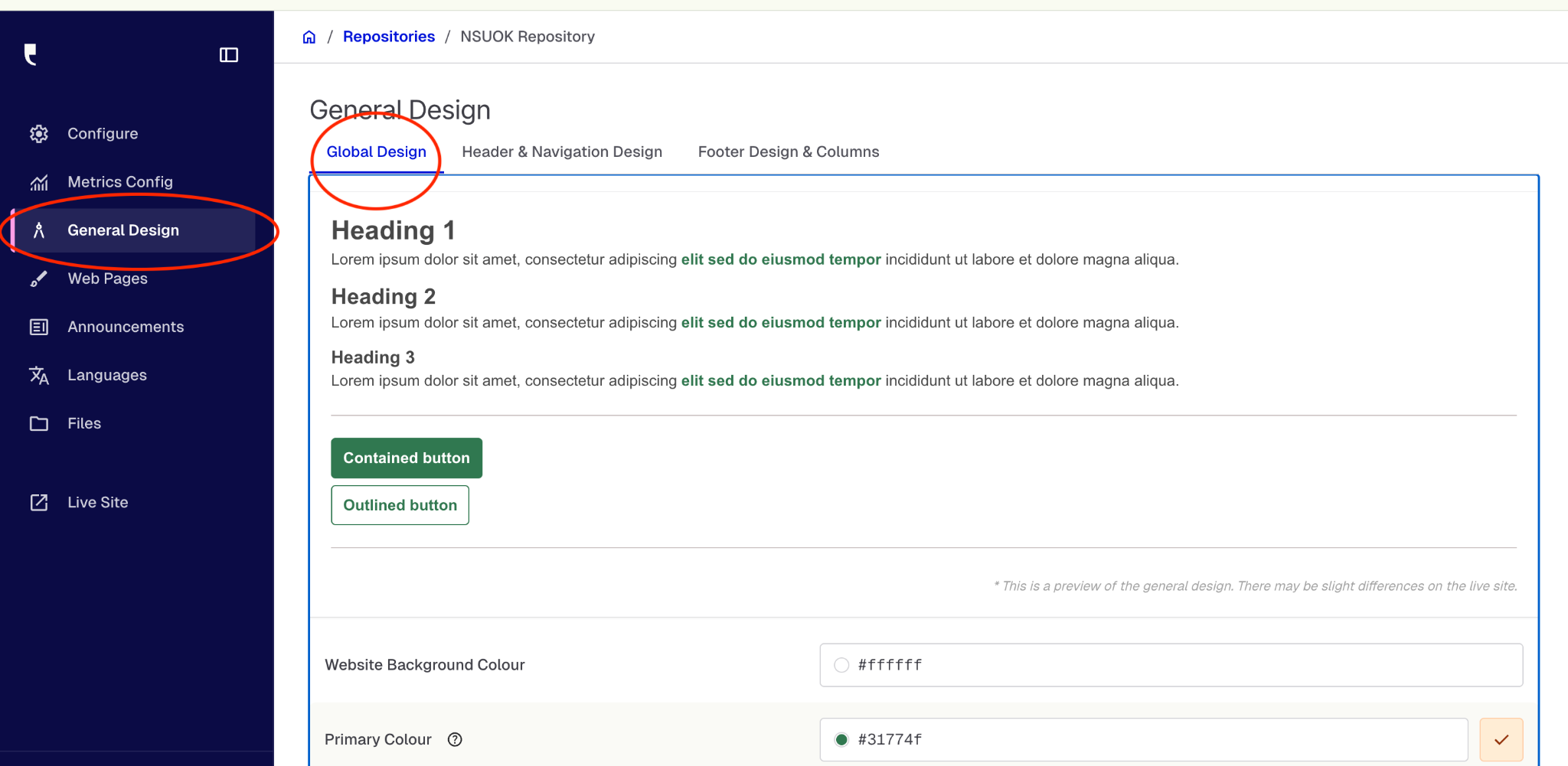 To change site colors, select the General Design option in the lefthand menu of Central Station. Then navigate to Global Design beneath the page heading.