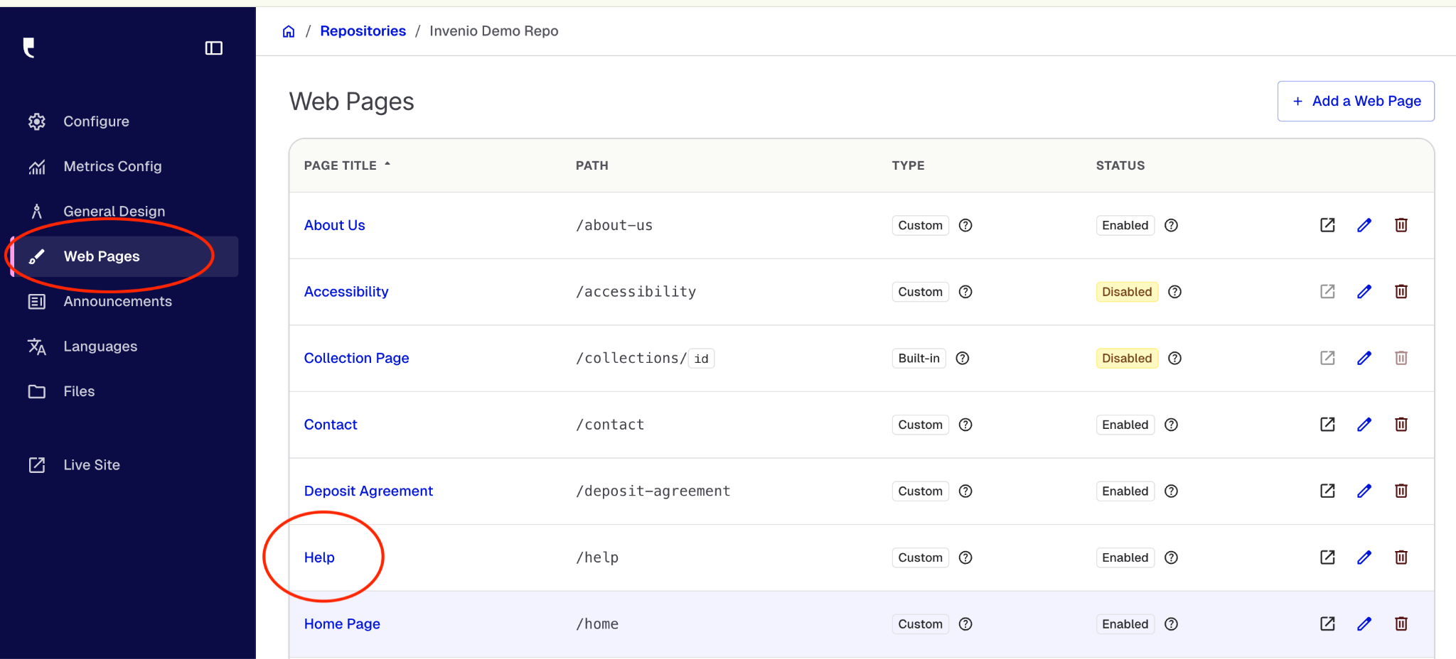 To edit the Help page, first click on Web Pages in Central Station’s lefthand menu. Then select Help from the list of web pages. (Because pages are displayed alphabetically, “Help” should be near the middle of the list.)